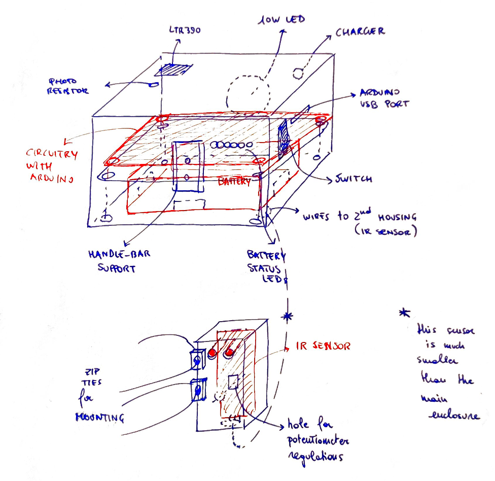 The brightness of the light depends on 3 variables: ambient light, UV light and speed. Each of them has a “weight” of importance (20%, 50%, 30% respectively). The ambient light is a result of 2 sensors working in pair (a light-dependent resistor and the ambient light sensor of the LTR390), in this way it is possible to reduce the variance in the data. The UV light is computed by the LTR390 and the speed is computed thanks to a IR module mounted close to the wheel (we will get into that in the next part).